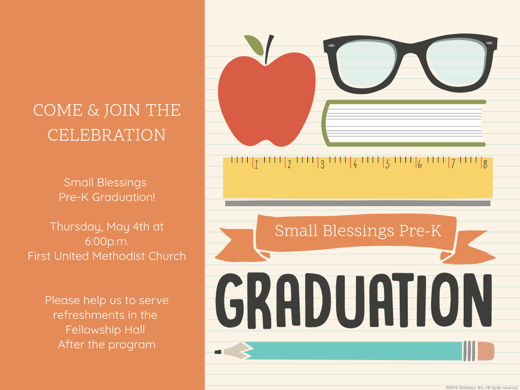 Small Blessings Pre-K Graduation May 4th, 2023 6:00 pm All Church Event Children Countdown Family Ministries Featured Small Blessings Ceremony in the FUMC Sanctuary and Refreshments to follow in the Fellowship Hall Volunteers Needed!!! Contact Small Blessings to Sign Up Save the Date SHARE ON Twitter Facebook Buffer LinkedIn Pin It