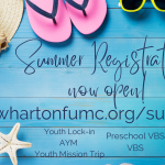 Register for summer activities on our website www.whartonfumc.org/summer May 20-21 Youth Lock-In June 19-22 Preschool VBS (3, 4, and 5 year old’s) June 29th Galveston Beach Day July 10-14 VBS (Pre-k through 5th grade) July 16-22 AYM Mission Trip with Strawbridge UMC