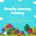 You are invited to our April Family Sunday Funday on April 25th from 12-3 at Dinosaur Park! We are going to play picnic games and just enjoy a beautiful afternoon of whole church family fun! Bring your own picnic food and meet us there after worship!